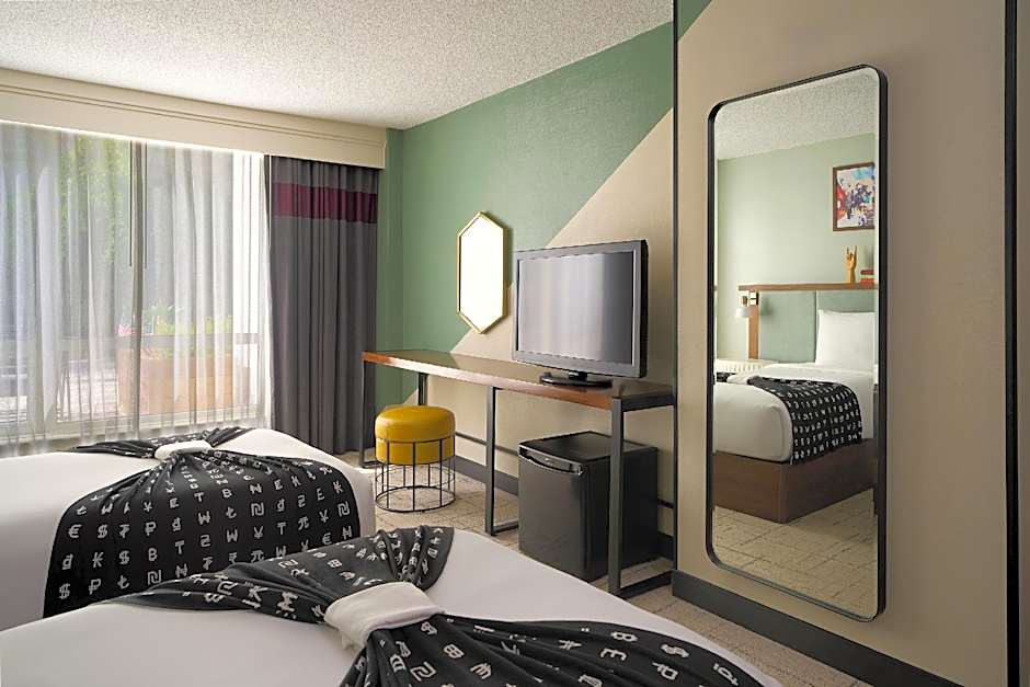 Offering a small refrigerator and a safe, this modern room features a flat-screen TV.